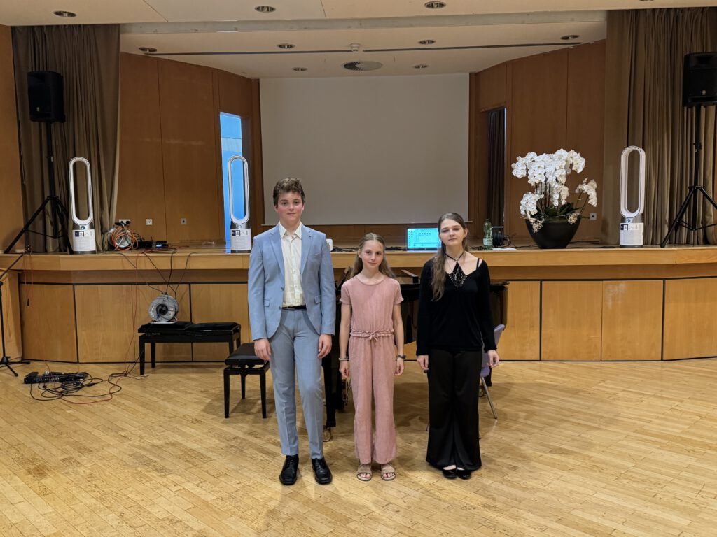 Karl-Adler-Wettbewerb am 29.06.2025 in Stuttgart. Jan-Felix Burkhardt, Fee-Marie Burkhardt und Taisia Schuk sind erste Preisträger in der Kategorie Popgesang.