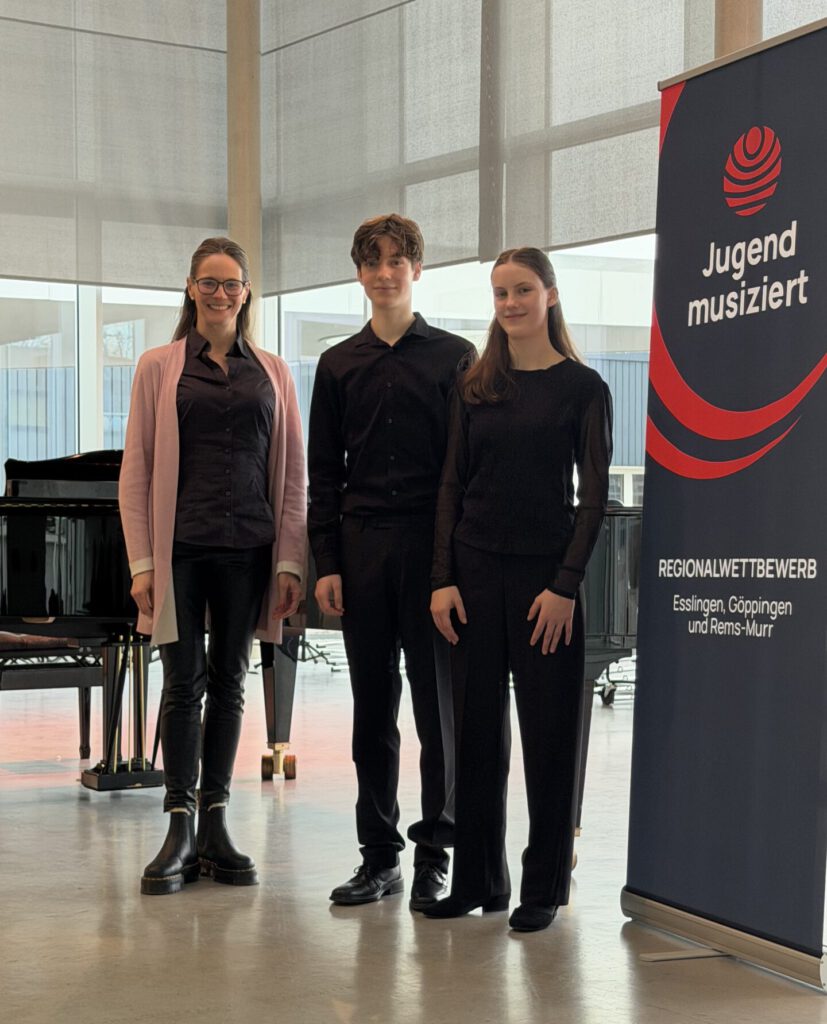 Jugend Musiziert 2025. Dieses Jahr wieder mit der Kategorie Pop Gesang. Vier meiner Schüler*innen wurden auf der Regionalebene mit ersten Preisen ausgezeichnet, einmal sogar mit der Maximalpunktzahl von 25 Punkten. Im Landeswettbewerb gab es dann drei erste Preise und zwei Weiterleitungen zum Bundeswettbewerb in Wuppertal. Das Foto entstand am 09. Februar beim Preisträgerkonzert in Waiblingen (Linda Schönberger, Jan-Felix Burkhardt, David Schönberger von l. nach r.).